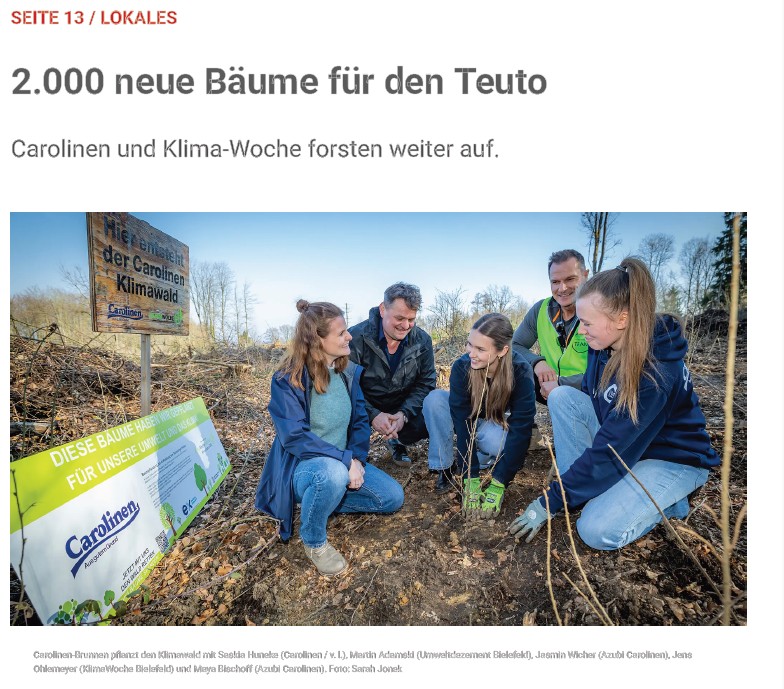 Die Pflanzaktion trugen vor allem Auszubildende von Carolinen; sie hatten bereits im Vorjahr 2.000 Setzlinge in die Erde gebracht. Mit einem Vorgängerprojekt am Hermannsweg stehen seit 2021 bereits 5.000 junge Bäume, insgesamt summiert sich der Beitrag von Carolinen im Teutoburger Wald damit auf rund 9.000 Bäume.
